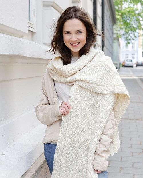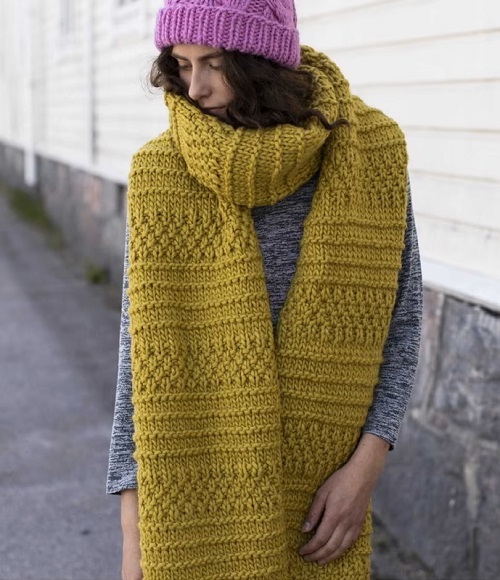 Novita Hygge created this scarf pattern using super bulky yarn and US 15 single-point needles. It is perfect for intermediate-level knitters, and the finished size is 35 cm × 245 cm.