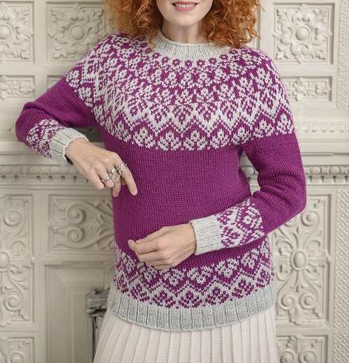 Inspired by Scandavian designed, Pirjo Livonen has knitted this beautiful sweater. The repeated floral pattern around the hem, cuff, and yoke gives it a simple yet subtle look. It overall looks balanced and gives a relaxed fit too.