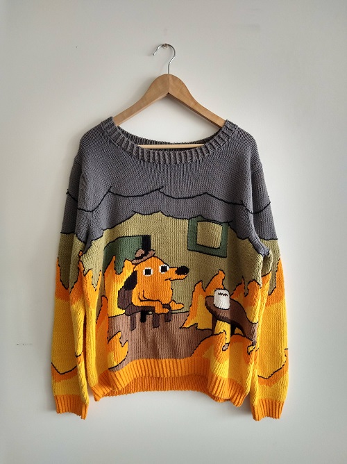 Inspired by the “This is Fine” cosmic dog meme, Yu Jie 玉杰 has knitted this bold yet unique sweater. The colorwork makes it an eye-catching piece, while the ribbed cuffs and hem provide a texture. It’s a great design if you enjoy making unique and expressive pieces.