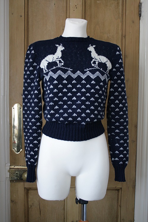 Have a look at this lovely reindeer jumper by Archive is a classic crew neck sweater inspired by the traditional winter patterns. All you need is 8 skeins of 3-ply wool, and it measures approximately: from the shoulder, 18 inches; width at the underarm, 32-34 inches; sleeve, 18 inches.