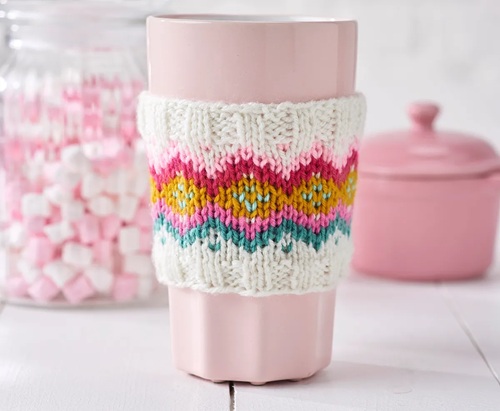 Treat yourself with this colorful mog cozy by Kirstie McLeod. It features classic fair isle motifs that instantly make the cozy look more detailed and interesting. If you want to practice stranded knitting on a small scale, then you must try this one.