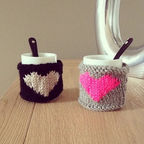 Looking for a pattern that uses all your stash yarn? Then have a look at Charlov. It features a lovely heart motif in the center of it. The cozy gives a comfy grip to the mug and keeps your drink warm.