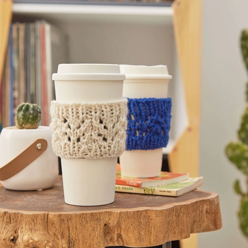 Alexandra Frankel shares the vanilla chai cup cozies design in 3 different sizes. They are easy to make and use basic stitches, so that anyone can knit them without stress. It features a twisted stitch cable pattern.
