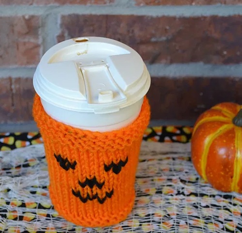 Looking for a fun way to dress up your mug for Halloween? This coffee cup cozy by Sarah E. White might be just what you need. It is worked in flat, with jack o’lantern features added in duplicate stitch, then the project is seamed up the back to make a sleeve