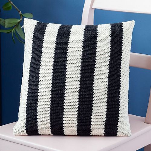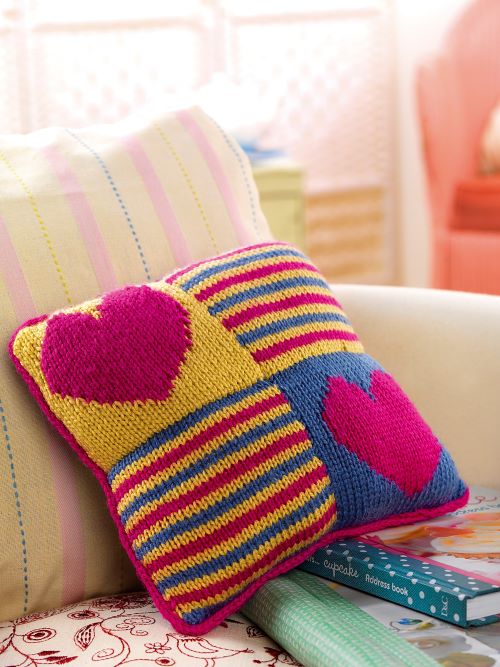 Amanda Berry has designed a cushion with the knitted squares sewn together, and then it is stuffed with toy filling. The stripes and intarsia color work give a versatile design that you can easily adapt to your style.