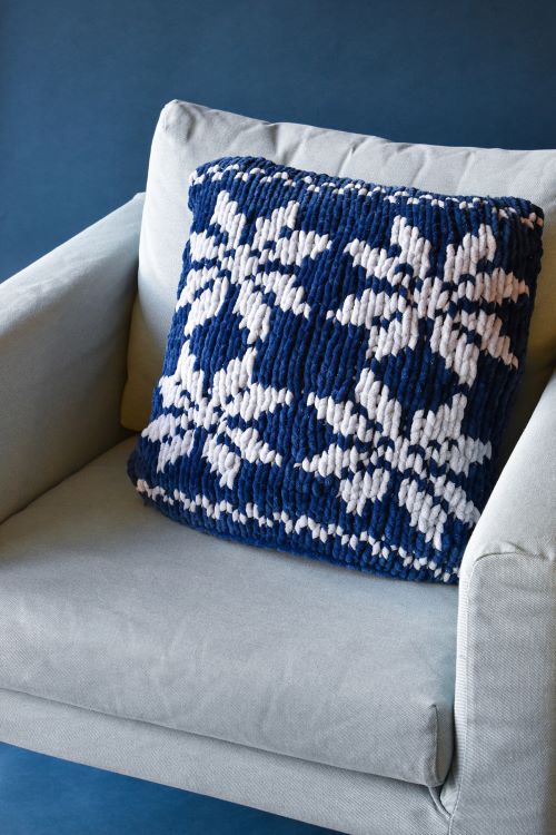 This cushion cover, designed by the Universal Yarn Design Team, has a clean, classic look that fits beautifully in any space with stranded colorwork. The snowflake on the cushion gives a winter chill to your wardrobe.