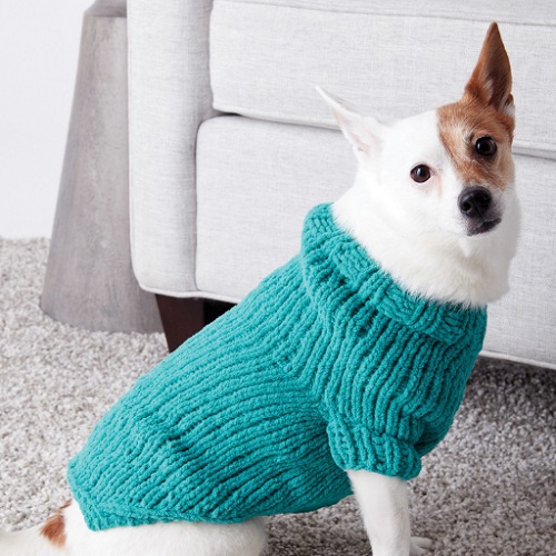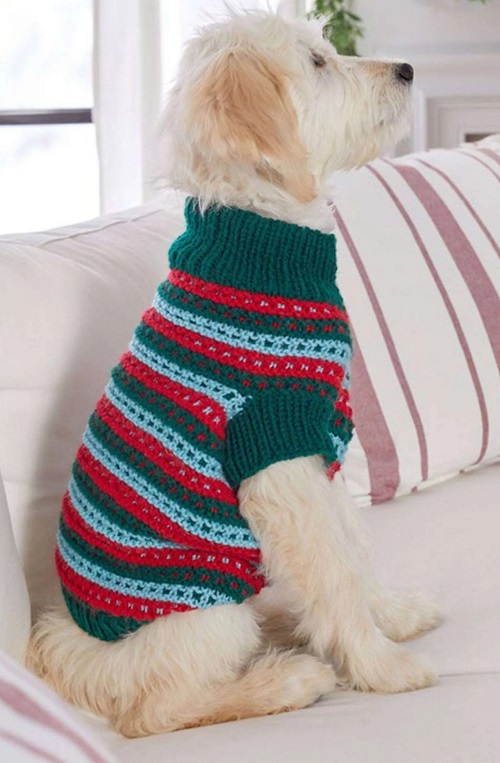 A colorful, rainbow sweater pattern for your loyal friend, created by Yarnspirations, is easy to care for and durable. You can knit this with leftover yarns of different colors and add it to your dog’s wardrobe.