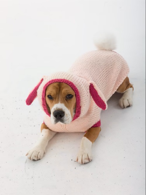 A bunny pattern by Lion Brand is suitable for beginners and can be knitted for a dog show or as a gift for pet lovers. Your pet will look cute and pretty, just like a rabbit.