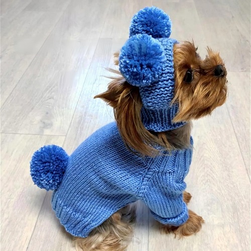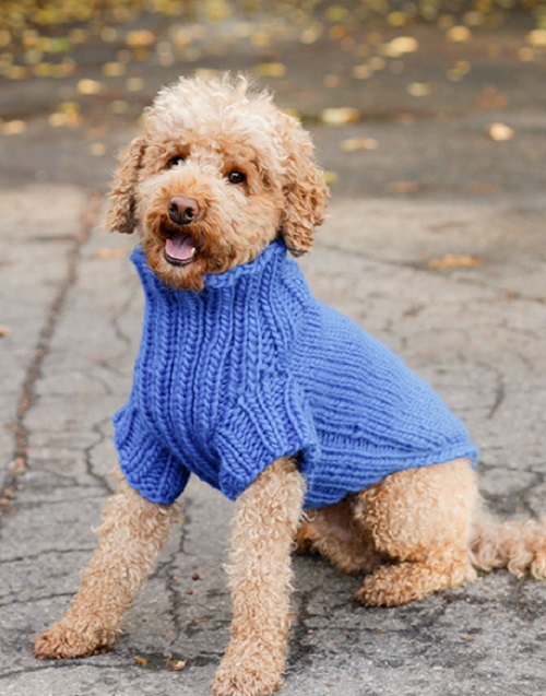 All dolled up for the spa, with a lovely headband and a pom-pom sweater, is waiting for you to get ready! This sweater project by Dog Boutique Knit has written instructions as well as a video of the entire knitting process.