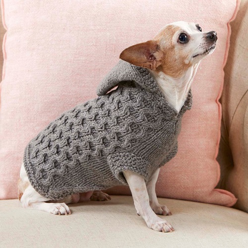 A cable knit sweater with a hood from Herrschners will bring a classic, heathered look to this pattern, offering timeless fashion for your furry family member. The honeycomb pattern of the cables keeps the design trendy.