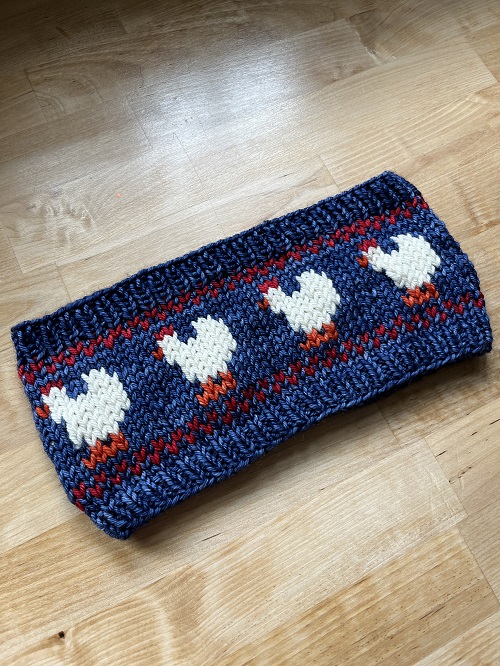 Take a look at this clucky lady’s ear warmer by RosiePosieKnitCo. Its fun colorwork design makes it a standout piece from a plain headband. The repeated chicken motif adds a cheerful and unique look to your winter accessory.