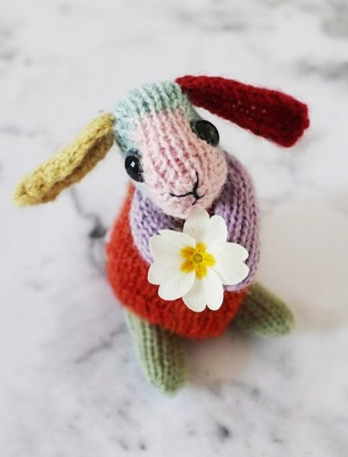 Easter is just around the corner, and what better way to celebrate than with a colorful bunny? This is a beginner pattern by Claire Garland, worked with sport-weight yarn and US 4 knitting needles.