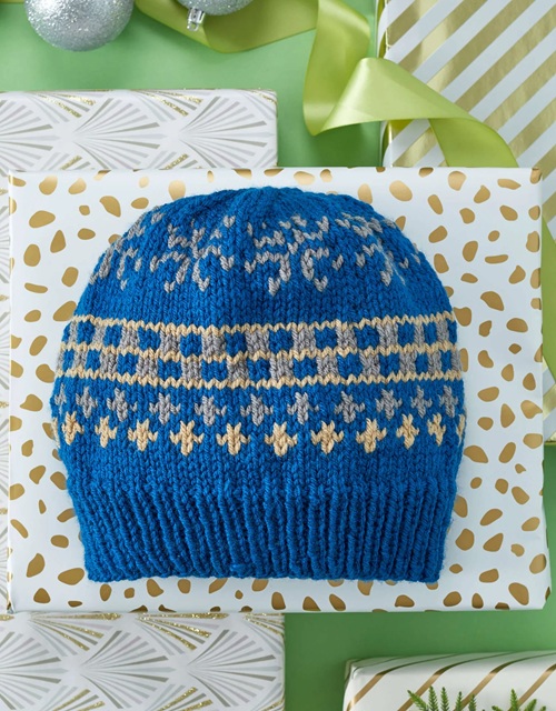A vibrant and updated classic fair Isle look by Yarnspirations is perfect for beginners. You can knit these in different high contrast shades for maximum effect. It will be a thoughtful gift for your special brother or your cool dad.