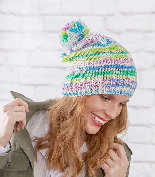 Yarnspirations has designed this beautiful hat, which seems magical in the pastel shades. It is stitched flat and then seamed up the back, so there’s no need to juggle multiple needles.