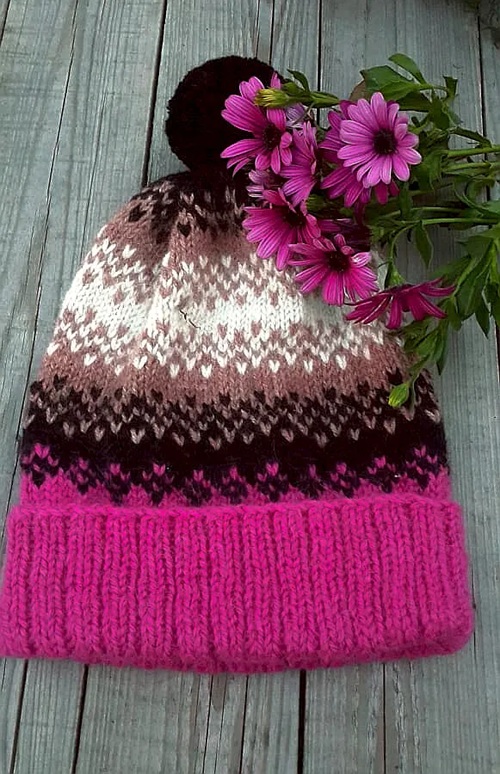 This intermediate skill-level pink beauty hat pattern by Vetka has elegance in every stitch. It is worked in rib stitch and then features colorwork in stockinette stitch. A pom is attached to the top to increase the charm of the hat.