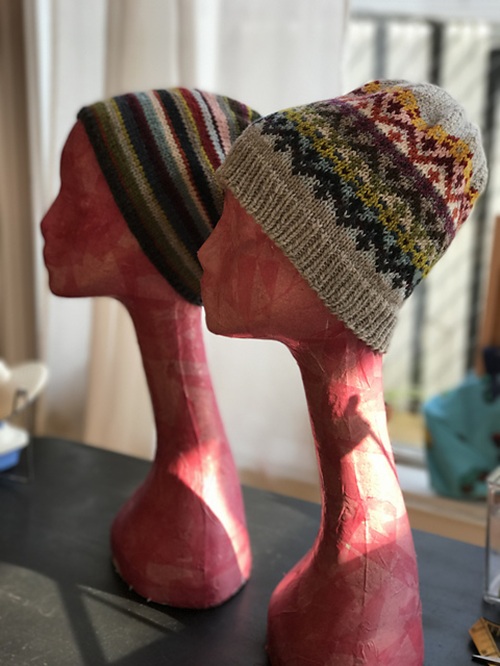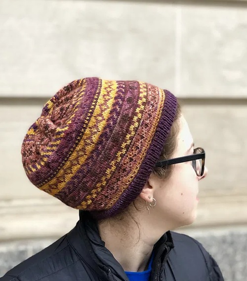 Arianna Soloway has knitted this beautiful hat, which features fair-isle motifs all the way to the top. For this, you will need mini skeins of light-fingering yarn in five different colors.