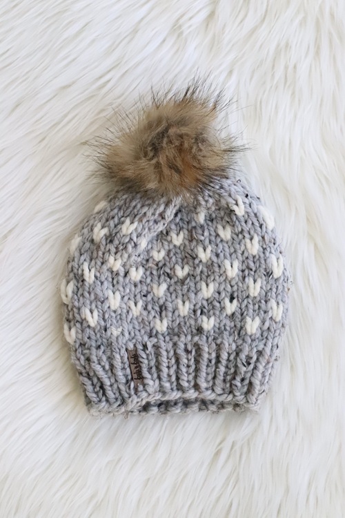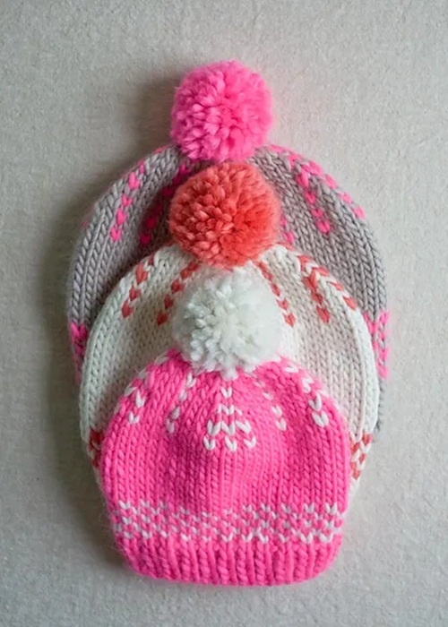 This cute and toasty hat pattern by Laura Ferguson is available for babies, kids, and adults. The pink and white make a great combination with a pom-pom, giving a signature finish. The knitting gauge is 13 stitches and 18 rows = 4 inches in stockinette stitch.