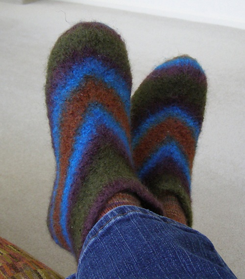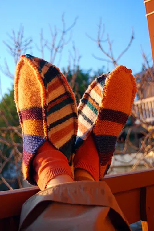 Claudia Olson is behind these slippers. These slippers use increases in stocking stitch with worsted yarn. The clean, useful design makes them a great choice for anyone who wants reliable indoor slippers without extra embellishments.