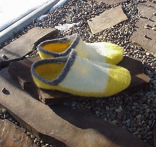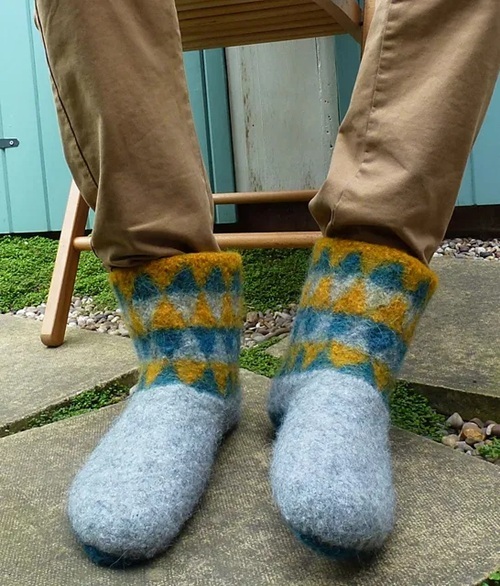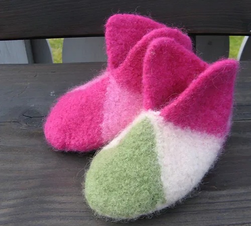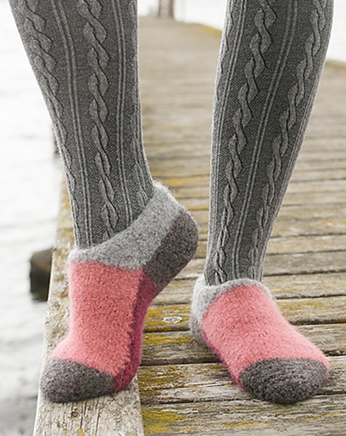 Garnstudio is the fantastic creator of this sorbet slipper. The piece is worked back and forth in one piece and sewn together before felting. They are easy to make, fun to wear, and a great project if you want something simple and stylish.