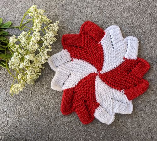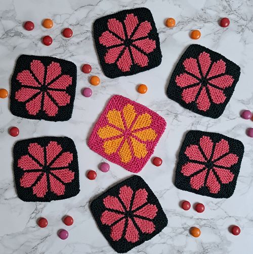 CH Knitting has designed this colorful and eye-catching knitting design that creates a flower-like coaster with alternating petals. The pattern uses simple shaping to form each section, giving the coaster a neat and textured look.