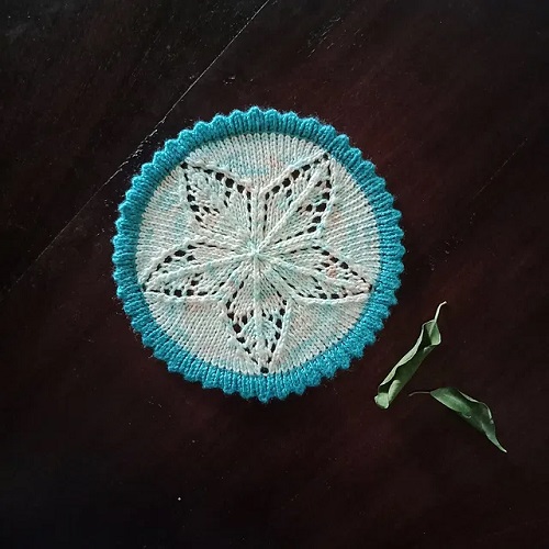 Arina Shofiya is the amazing knitter behind this cute coaster design, which has a picot edging and a delicate lace pattern in the center. All you require is fingering-weight yarn with 2 / 2.75 mm DPNs or circular needle for magic loop & a 3.0 mm crochet hook for provisional cast on.