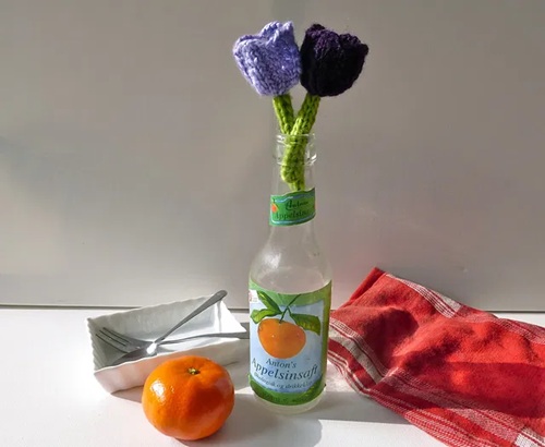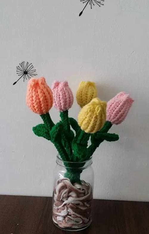 Bring home the tulip fields of Europe in a vase! Christie Foo created this loom-knit tulip flower. It is knitted using any color worsted chunky yarn for double strands and green color for single strands.