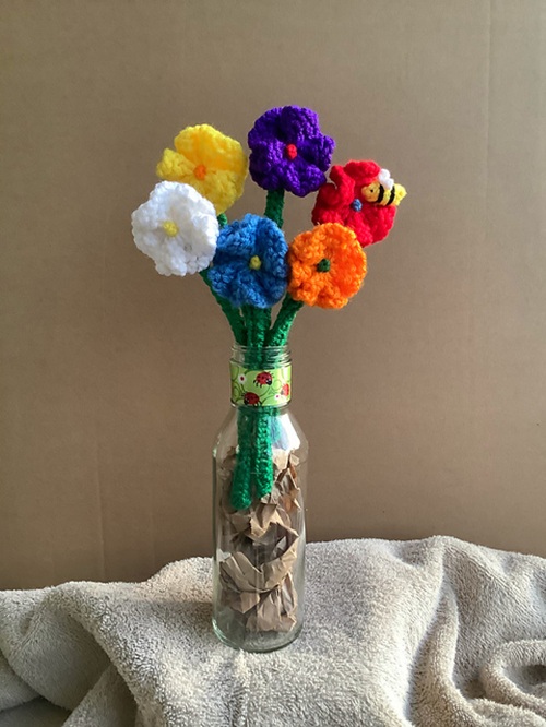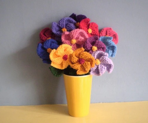 A knitted bouquet will be the best gift, created by Dody Hall, who uses E-wrap, purl, and u-wrap stitches. It can be accomplished using a round or flat loom and scrap yarn.