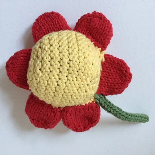 A flower that can be a toy, a hot-and-cold pack, and a teether is designed by Sandra Ronca. It is recommended to fill it with dry lentils as they are very pliable and soft, but dry corn or beans, or a mix of these will work as well. You can also use a gel pack.