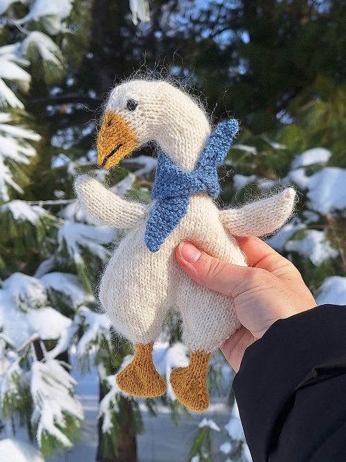 Myriam’s Wool Works is behind this charming and realistic knitted goose design. The pattern is a fun and cheerful project that brings a cute little goose to life. With its round body, tiny wings, and bright beak, this knitted toy has a friendly and playful look.