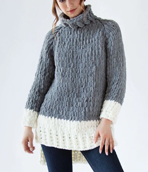Wrap yourself in this oversized knitted pullover by Yarnspirations. It’s a good pattern for anyone who wants to knit a basic, cozy pullover that feels relaxed and easy to wear every day. The furry textures make it more charming and soft.