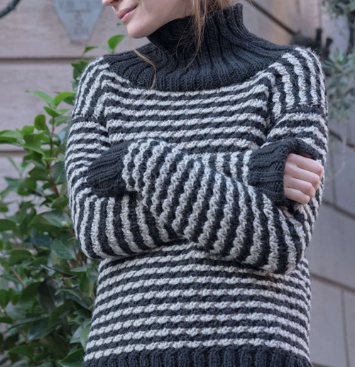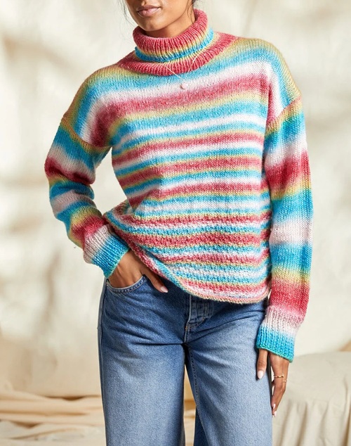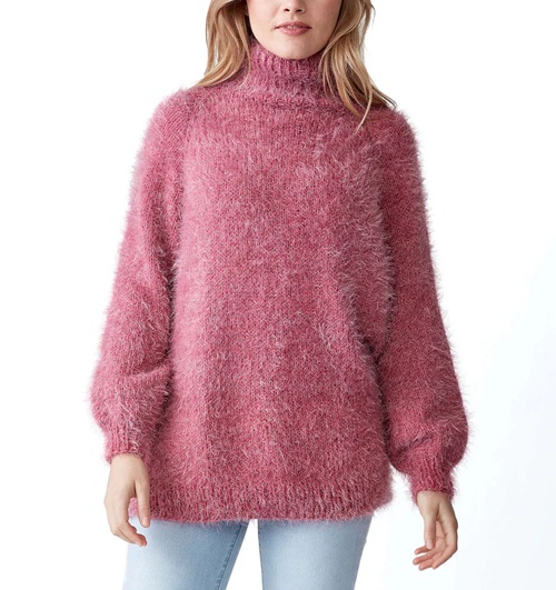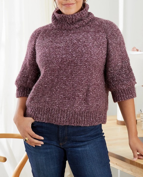 New to knitting a sweater, then have a look at this turtle neck pullover by Yarnspirations. The clear shaping and basic stitches will help you to make this quickly and easily. And the yarn texture makes it a standout piece.