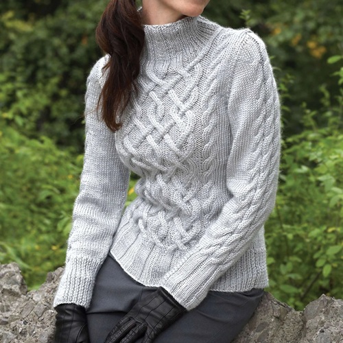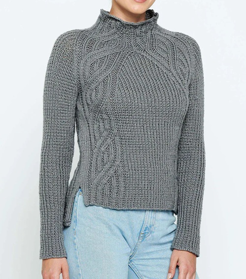 This knitted sterling cable sweater by Yarnspirations is a cozy high-neck design for the winter. It features cable work across the front and sleeves without feeling heavy. You can create in a different size with the instructions provided.
