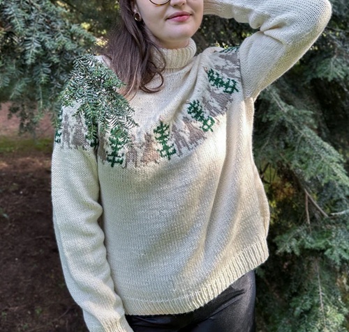 The knitted abbraccio sweater by Yarnspirations is a soft, comfortable high-neck sweater with a relaxed shape. It’s easy to wear and gives a neat, clean look. The design uses simple stitches, so the sweater feels smooth and cozy. An excellent project for everyday use.