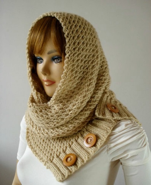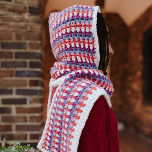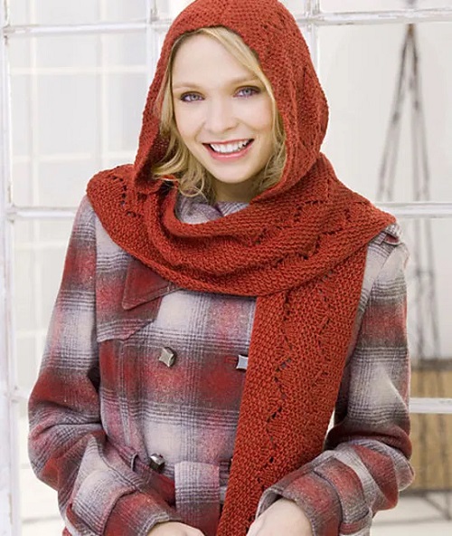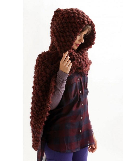 Gina Michele designed a pretty hooded scarf pattern for beginner-level knitters. This will keep you warm, even in snowfall, and before you know it, it will become your favorite winter accessory.