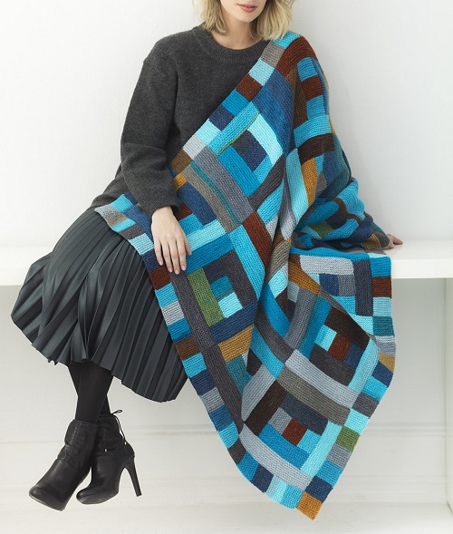 An easy-level pattern by Irina Poludnenko features multiple colored rectangles, especially shades of blue. It is made with lightweight yarn and is available only in one size.