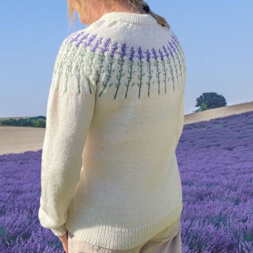 Knit your favorite lavender flower on the white sweater using this pattern by Garnstyrelsen. It is worked top-down, and the sleeves use the magic loop method with a knitting gauge of 10 × 10 cm = 26 stitches × 34 rows.