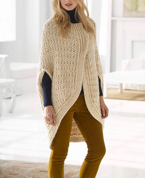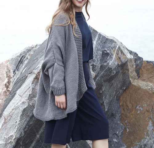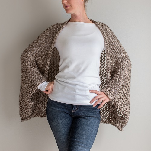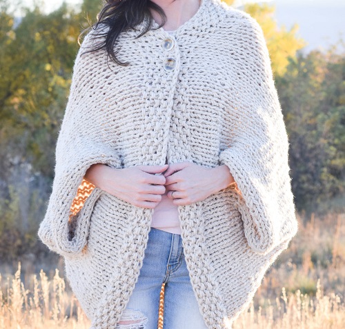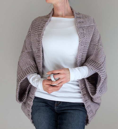A heavy, blanket-like cocoon shrug by Mama in a Stitch is easy and oversized, worked in stockinette stitch for a casual look. It is a statement piece, and you can wear it during the winter and enjoy the bonfire.