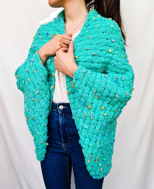 Knit this seamless blanket sweater by Bromefields, which is perfect for beginners. It is a cozy shrug that should be in everyone’s wardrobe. It is knitted flat, back and forth, using circular cable needles to hold the large number of required stitches.