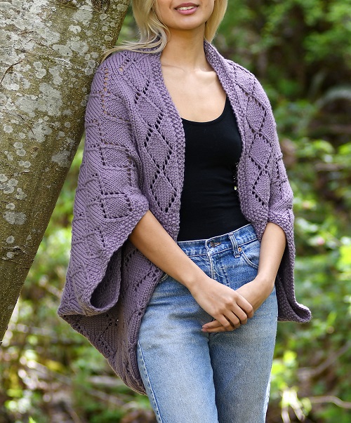 Wrap yourself in this lavender shrug by Cascade Yarns, which is elegant and will keep you warm. The knitting gauge for this pattern is 14 stitches × 20 rows = 4″ in stockinette stitch.