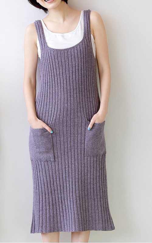 Lavender midi dress by Lana Gatto uses K1, P1 rib-garter stitch, stocking stitch, and fancy stitch. To knit this, a pair of 4 mm knitting needles is required. This is a perfect outfit for a winter date.