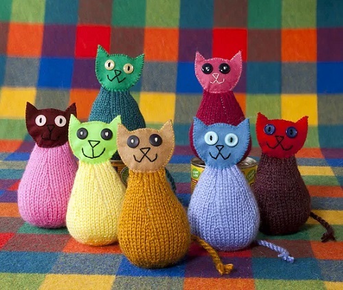 Create a group of kitties with the help of the Cute Knit Toy blog. The head, body, and tail are knitted in one piece in a round. The legs from the live stitches are separated in advance, and the ears are sewn on.