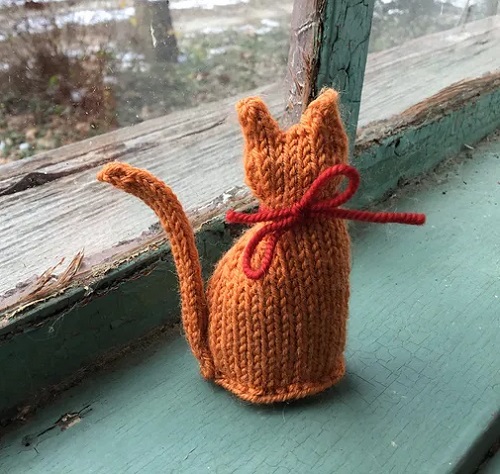 A 3-inch tiny cat by Sara Elizabeth Kellner is worked using worsted yarn and US 4 knitting needles. It is a quick knit which is worked in the round and all in one piece.