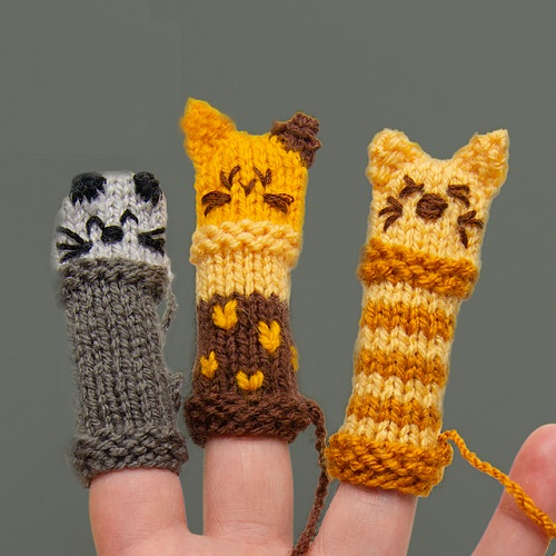 Arrange a puppet show of your own with this Cher Marcus kitty fingers pattern. The knitting gauge is 20 stitches and 24 rows = 10 cm. These colorful kitties will be fun to play with your kids.