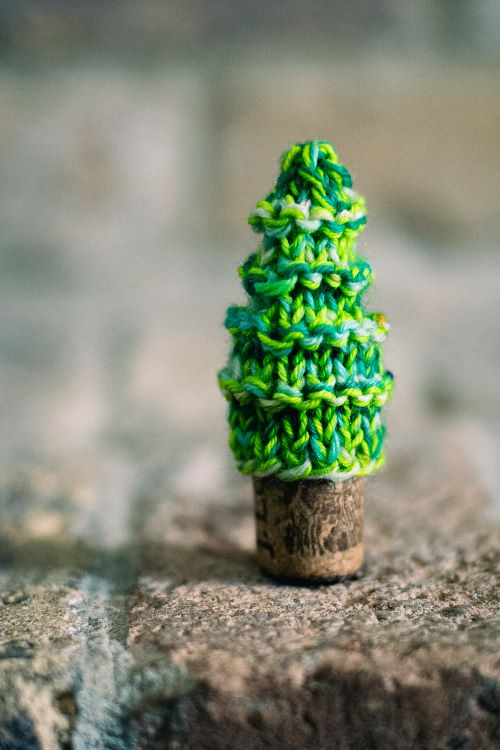 Corina Irvine has knitted this tree, which measures 2.5″ tall and is worked with fingering and DK yarn weight held together. The knitting gauge for this pattern is 5 stitches and 7 rows = 2.5 cm.