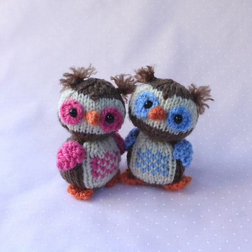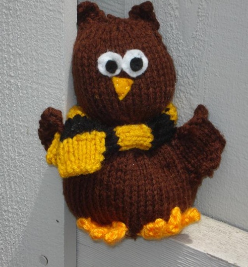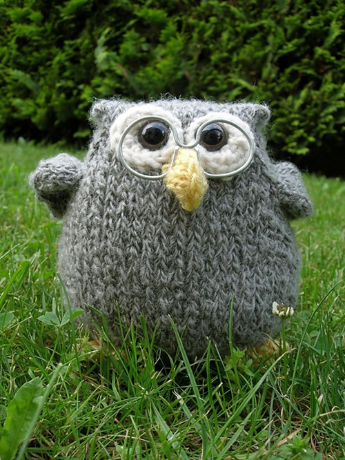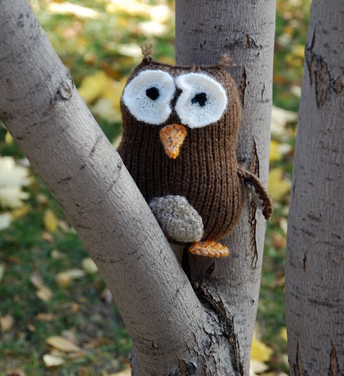 R Giddings has designed this owl in red, which is easy to make and easier to love. It is knitted in pieces and sewn together. Most of the pieces are worked in circles and knitted flat as a spiral.