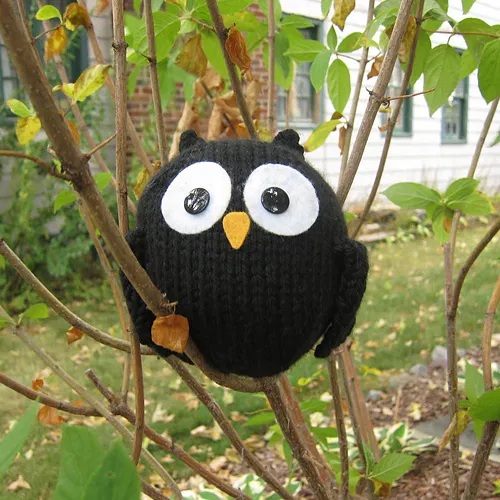 A tiny owl by Kat in black with those big eyes and flat nose makes it perfect for Halloween to haunt. It is knitted in the round on double-pointed needles, and you only need to know basic increases and decreases.