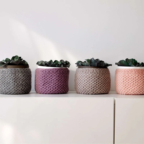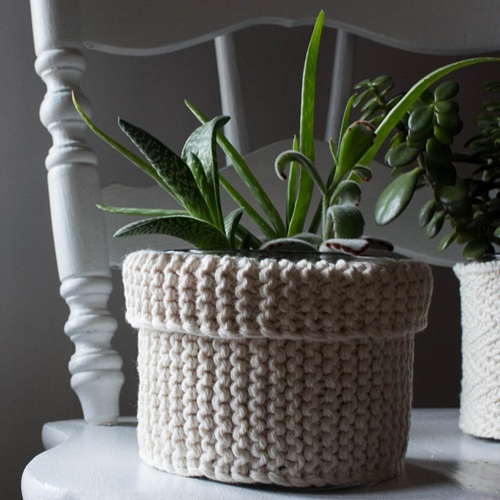Try your hand at this amazing herringbone plant pot cozy knitting pattern by Bromefields. It features a textured stitch that gives plant pots a neat and structured look. The herringbone design adds subtle visual interest while keeping the overall style simple and clean.