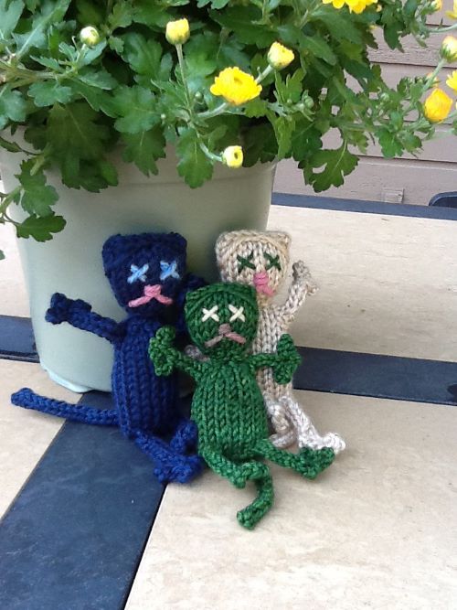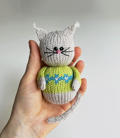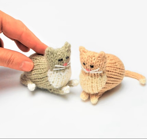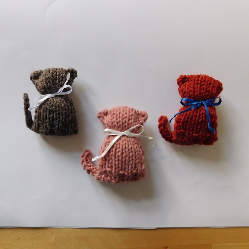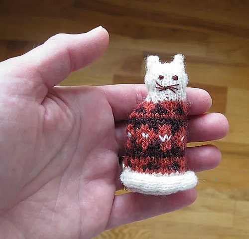 A tiny version of a regular cat is 3 inches long, excluding the tail, and was designed by Sara Elizabeth Kellner. It is worked in the round and all in one piece, which knits up very quickly.