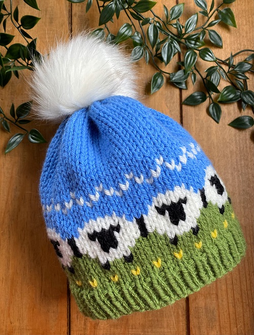 How about this pretty hat from Etsy? It uses intermediate knitting techniques. Plus, it has eye-popping colors and a sheep design on the top.