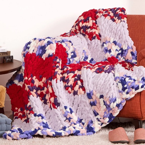This blanket from Yarnspirations is an excellent choice if you want a design that feels modern and comfy. All you need is three different colors of yarn and a 25mm knitting needle. And the best is that the pattern is beginner-friendly.